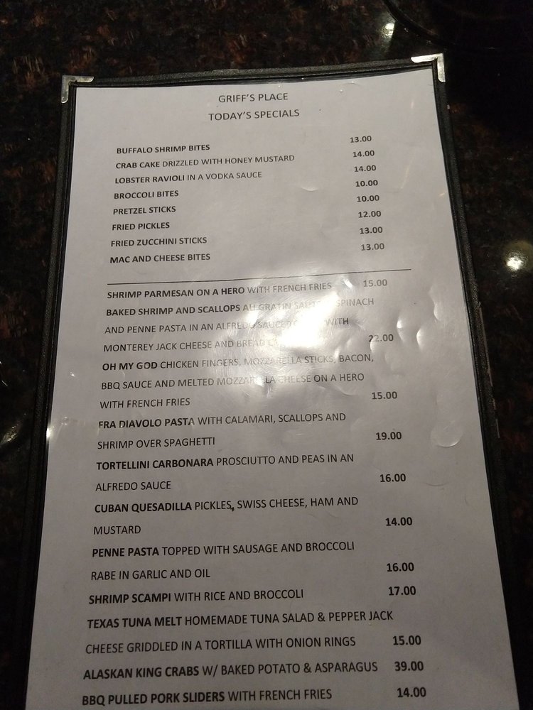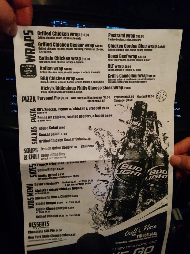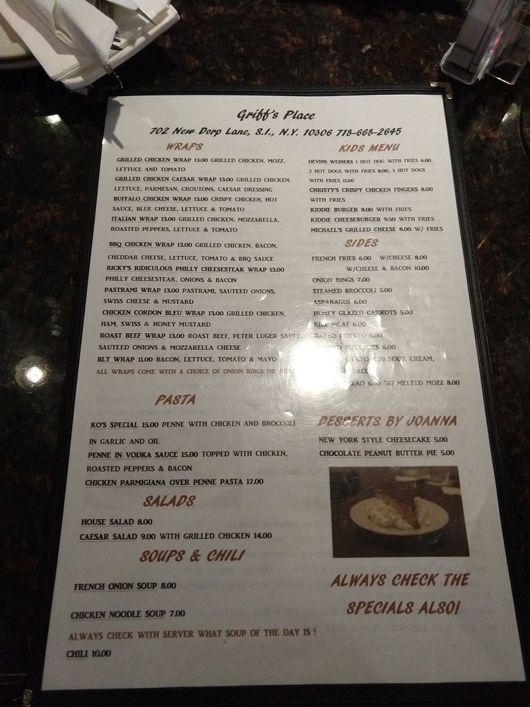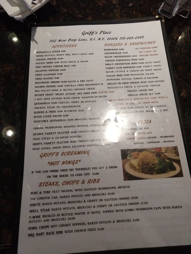 Griff's Place, located in New Dorp Beach, NY, is a hidden gem offering a mix of desserts, sports bar fare, and American classics. Known for their delicious wings, juicy burgers, and mouthwatering steaks, this spot has garnered rave reviews from patrons. The welcoming atmosphere, attentive service, and generous drinks add to the overall dining experience. Standout dishes include the pastrami wrap, garlic wings, and thick, juicy burgers. The outdoor seating area, pool table, and multiple TVs showing sports games make it a great spot for groups to gather and enjoy a meal. The owner, Domnick, is known for his hospitality and even treats patrons to shots. Griff's Place is a must-visit for those seeking quality food in a lively sports bar setting.